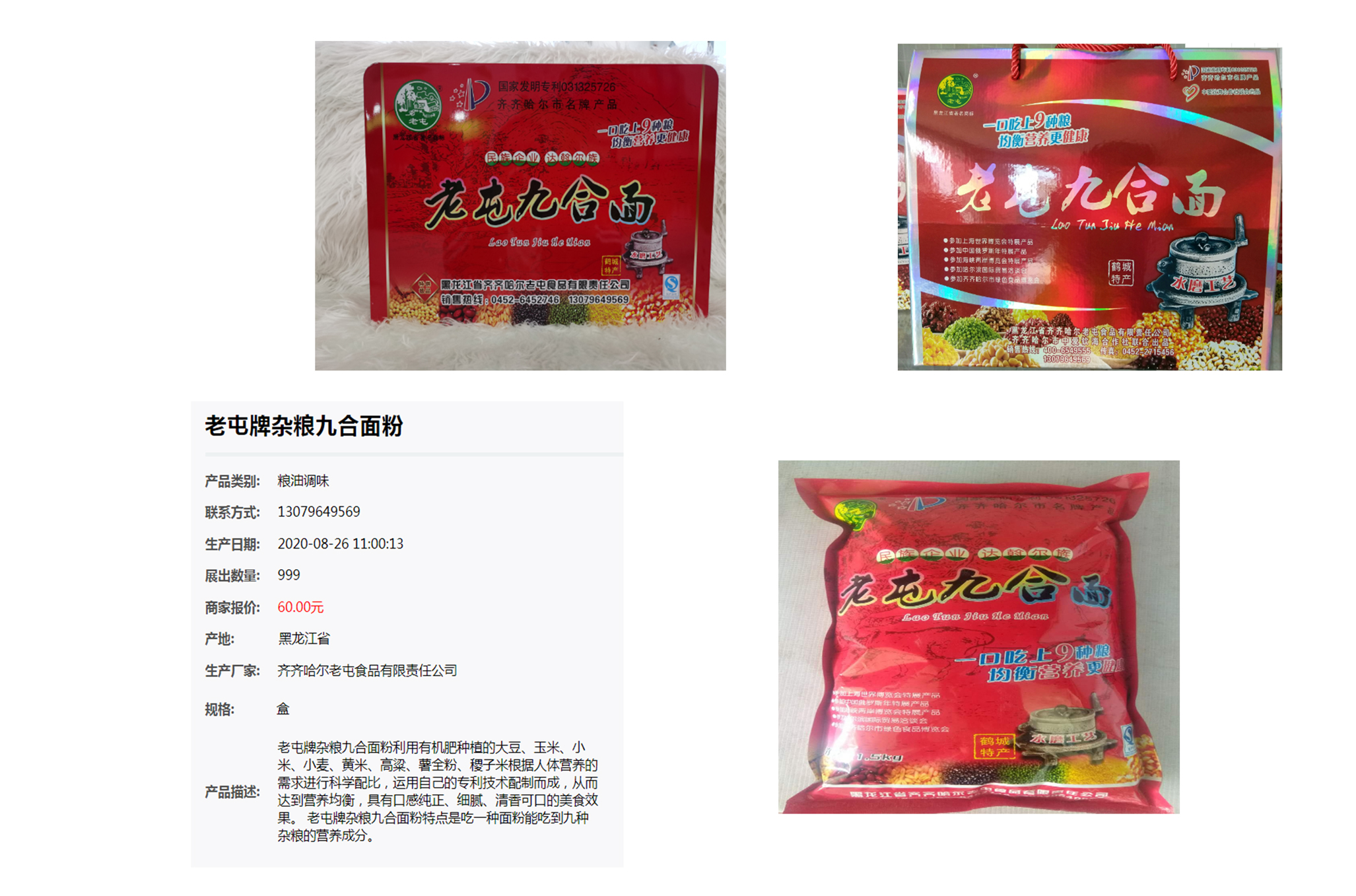 齐齐哈尔老屯食品有限公司。公司位于中国绿色食品之都——齐齐哈尔市梅里斯达斡尔族区。公司成立十多年来,坚持以生产绿色食品,力求美味健康,这一经营理念,开发了一系列绿色养生食品其中老屯牌九合面粉已成为中国国际专利与名牌博览会,金奖产品,广大消费者所青睐的放心品牌。公司被授予市级龙头企