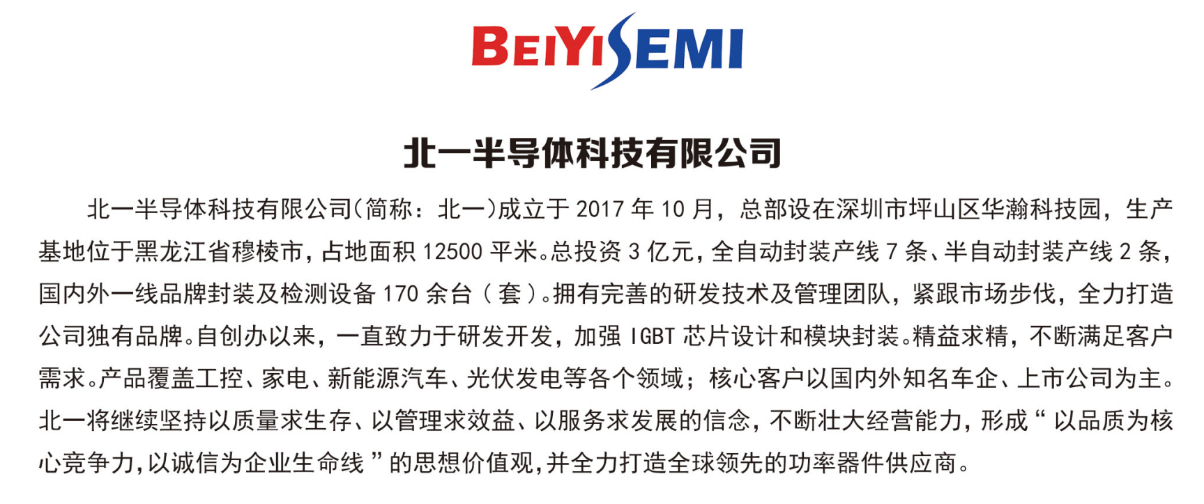 北一半导体科技有限公司(简称:北一)成立于2017年10月,总部设在深圳市坪山区华瀚科技园,生产基地位于黑龙江省穆棱市,占地面积12500平米。总投资3亿元,全自动封装产线7条、半自动封装产线2条,国内外一线品牌封装及检测设备170余台(套)。拥有完善的研发技术及管理团队,紧跟市场步伐,全力打造公司独有品牌。自创办以来,一直致力于研发开发,加强IGBT芯片设计和模块封装。精益求精,不断满足客户需求。产品覆盖工控、家电、新能源汽车、光伏发电等各个领域;核心客户以国内外知名车企、上市公司为主。北一将继续坚持以质量求生存、以管理求效益、以服务求发展的信念,不断壮大经营能力,形成“以品质为核心竞争力,以诚信为企业生命线”的思想价值观,并全力打造全球领先的功率器件供应商。