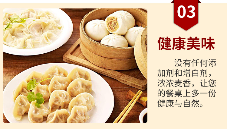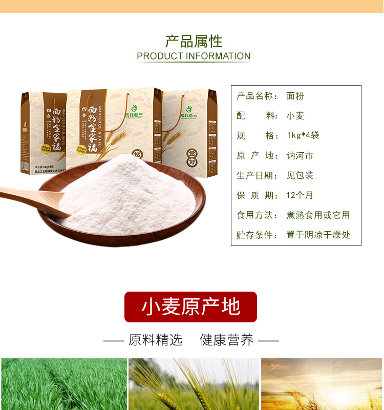 “东北老三”牌面粉使用低产、低分率硬质小麦作为原料,采用传统工艺加工,东北老三到底,营养全面。面粉不含任何添加剂,麦香浓郁、口感纯正。