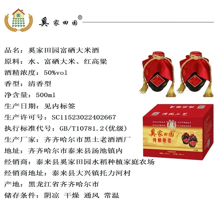 奚家田园富硒大米礼盒原浆酒,使用陶坛装酒,木塞和发酵猪血加上桑麻纸封口,保证酒的品质,适合多年储存,