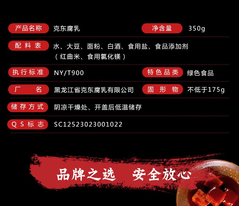 克东腐乳是一种传统的地方名特产品,始源于1915年,历史悠久、远近闻名。克东腐乳以地产含有丰富蛋白质的优质绿色大豆为主料,以大米、面粉、食盐为辅料,以十三味天然中划药为调香料,取用含有锶、锂、锌、碘、硒等稀有微量元素的清泉之水,采用独一无二的“微球菌”发酵技术,经三十多道工序、长达180天的发酵精心加工而成。产品不添加任何防腐剂和色素,将滋补与保健有机的融合在一起。克东腐乳含有18种人体所必须的氨基酸、维生素B1、B2、钙、铁、锌、硒等微量元素,且色鲜味美、柔软细腻、清新爽口、营养丰富,集品质优良和营养全