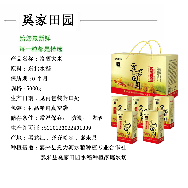 奚家田园礼品装富硒大米,有国家质量、农残、重金属残留、硒含量检测数据,安全、营养、健康、放心!精美的礼品盒包装,是您送亲朋、送领导健康食品的首选!