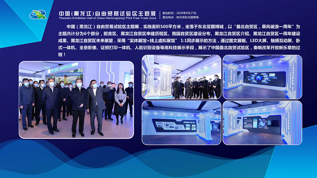 中国(黑龙江)自由贸易试验区主题展,实施面积500平方米,坐落于东北亚国博城,以“最北自贸区,乘风破浪一周年”为主题。分为6个部分,前言区、黑龙江自贸区神建历程区、我国自贸区建设分布、黑龙江自贸区介绍、黑龙江自贸区一周年建设成果、黑龙江自贸区未来展位。