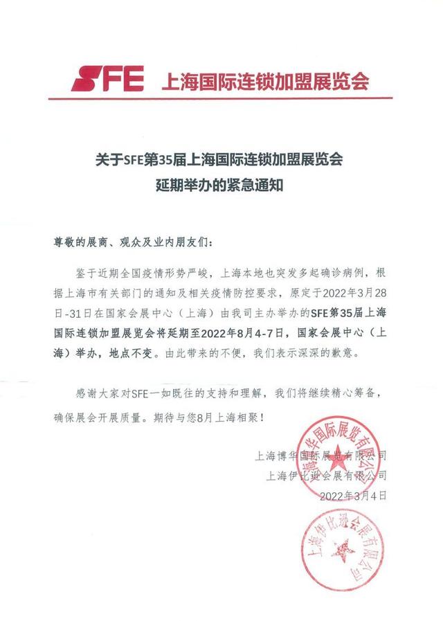 • 关于SFE第35届上海国际连锁加盟展览会延期举办的通知